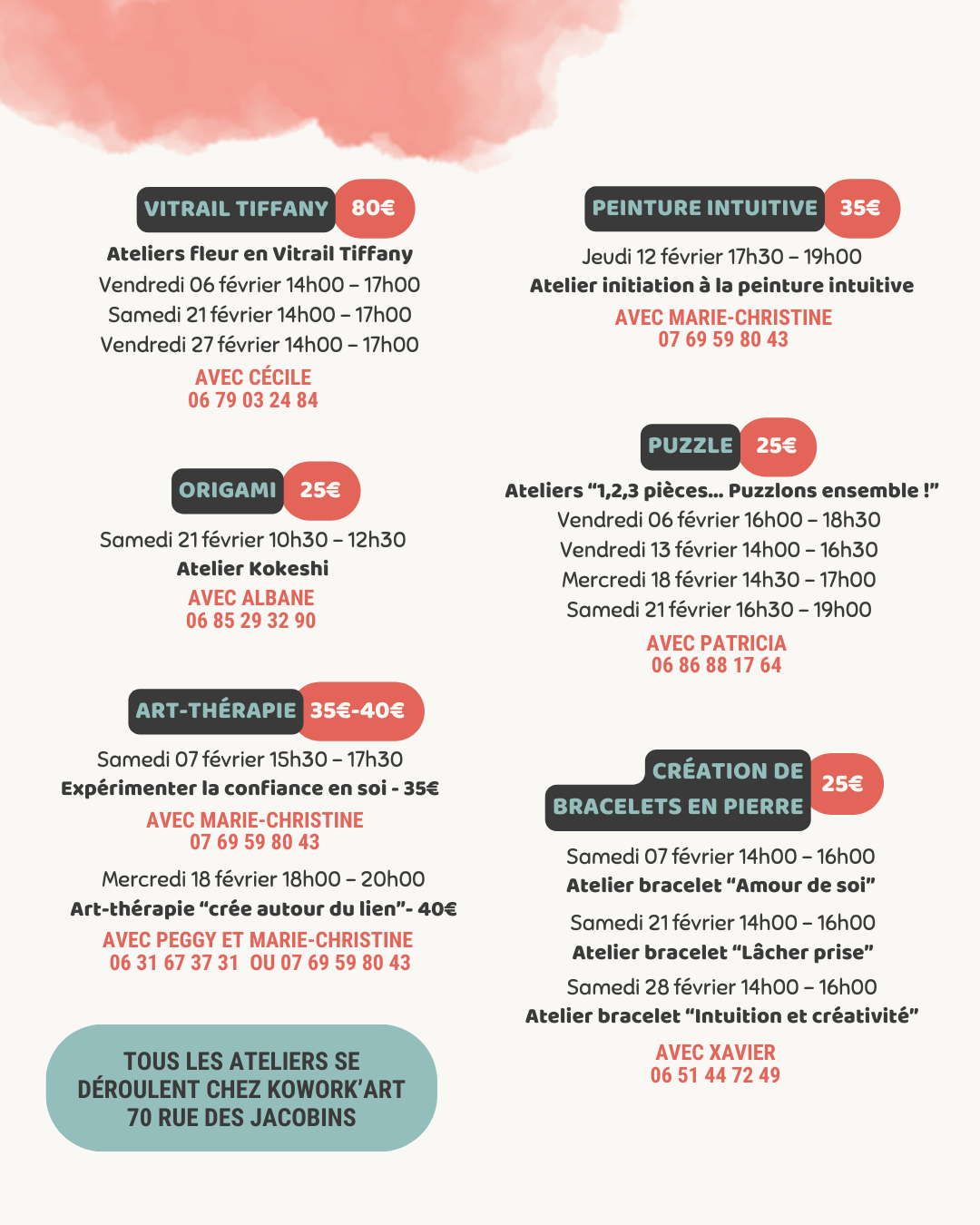Certains cours peuvent être programmés en dehors des horaires d’ouverture de l’atelier.