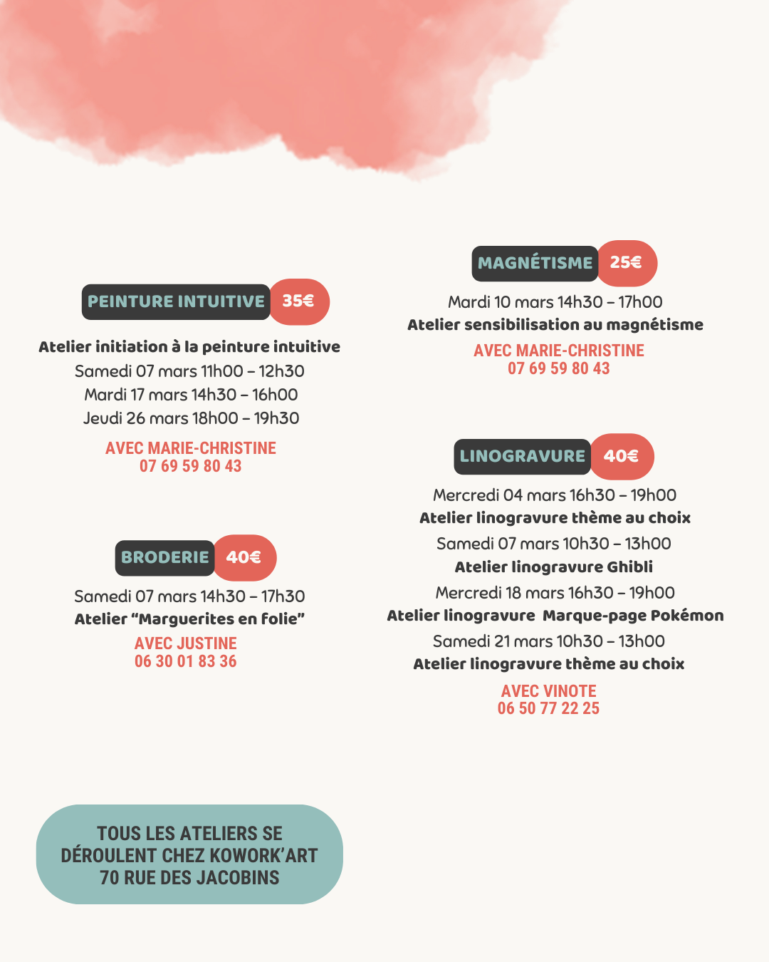Certains cours peuvent être programmés en dehors des horaires d’ouverture de l’atelier.